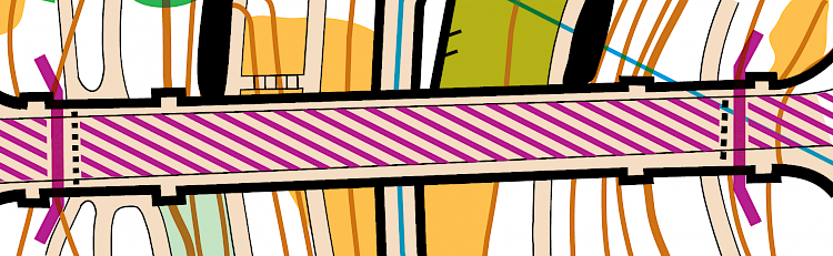 The area is crossed by two high road bridges, each mapped with a bold mauve bridge symbol at either end of the bridge. The optimum routes for Courses A, B and C pass under one of these bridges at least once. For clarity, the map does not show paths, tracks and roads where these are directly beneath these high bridges. There are no paths, roads or track that do not link to a path, road or track the other side of the bridge as shown on the map.