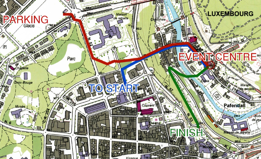 Please allow 20 minutes to get to the start – it is about 700 metres from the Event Centre, returning back up the Pfaffenthal panoramic public elevator, and branching away from the route from parking at a sign near the top of the elevator. The route to the Start will be marked with blue and white taping once it diverges from the route from parking.