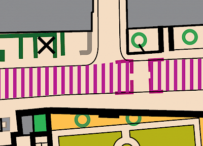 Some narrow passages and covered areas near the Start are not accessible on Sundays. These passages are marked on the map with a small mauve overprinted bar, at each gated entrance.